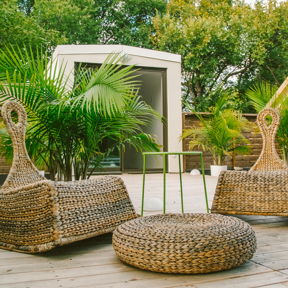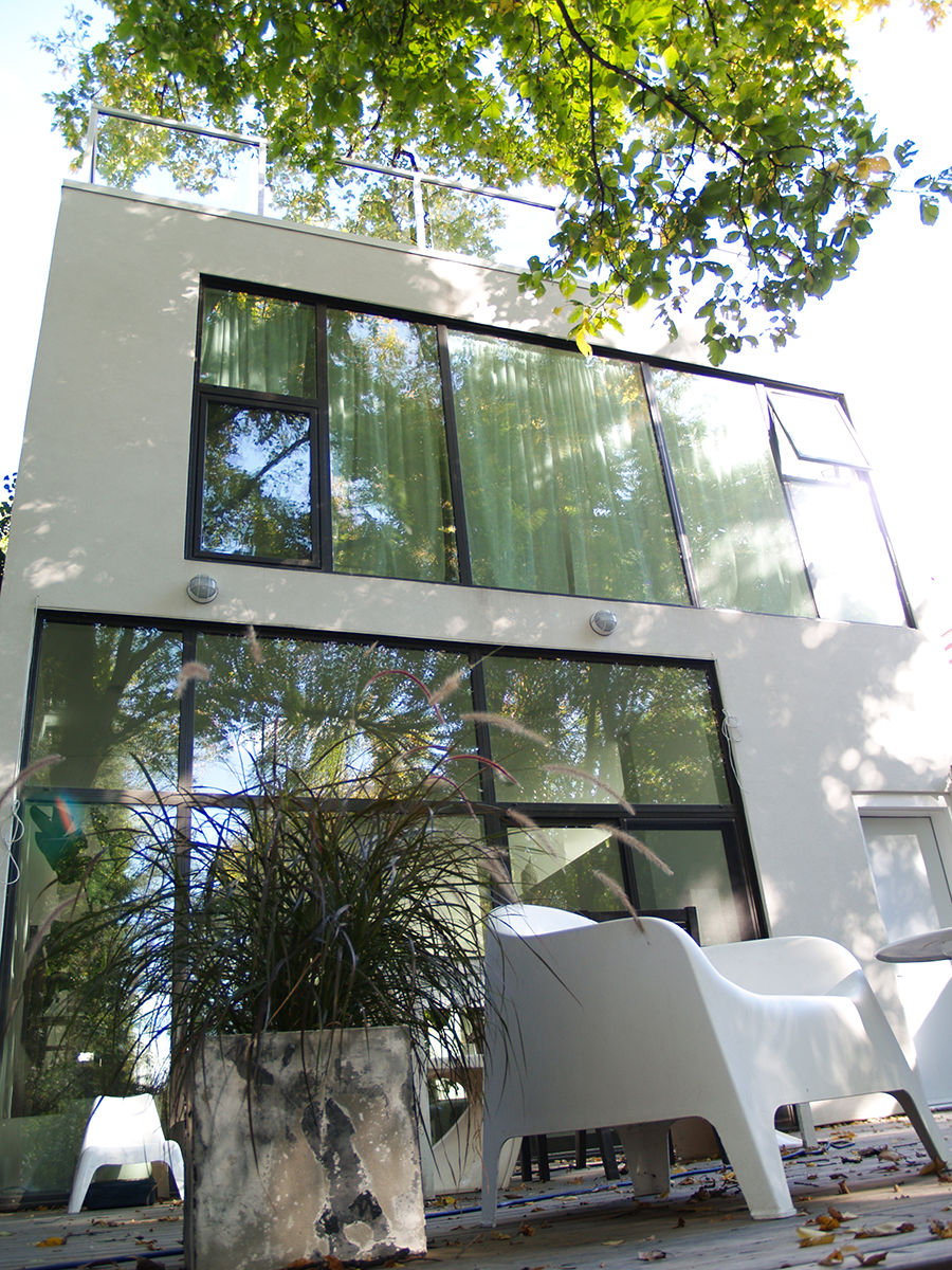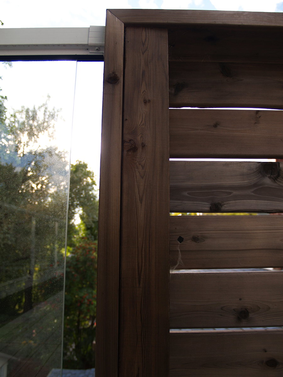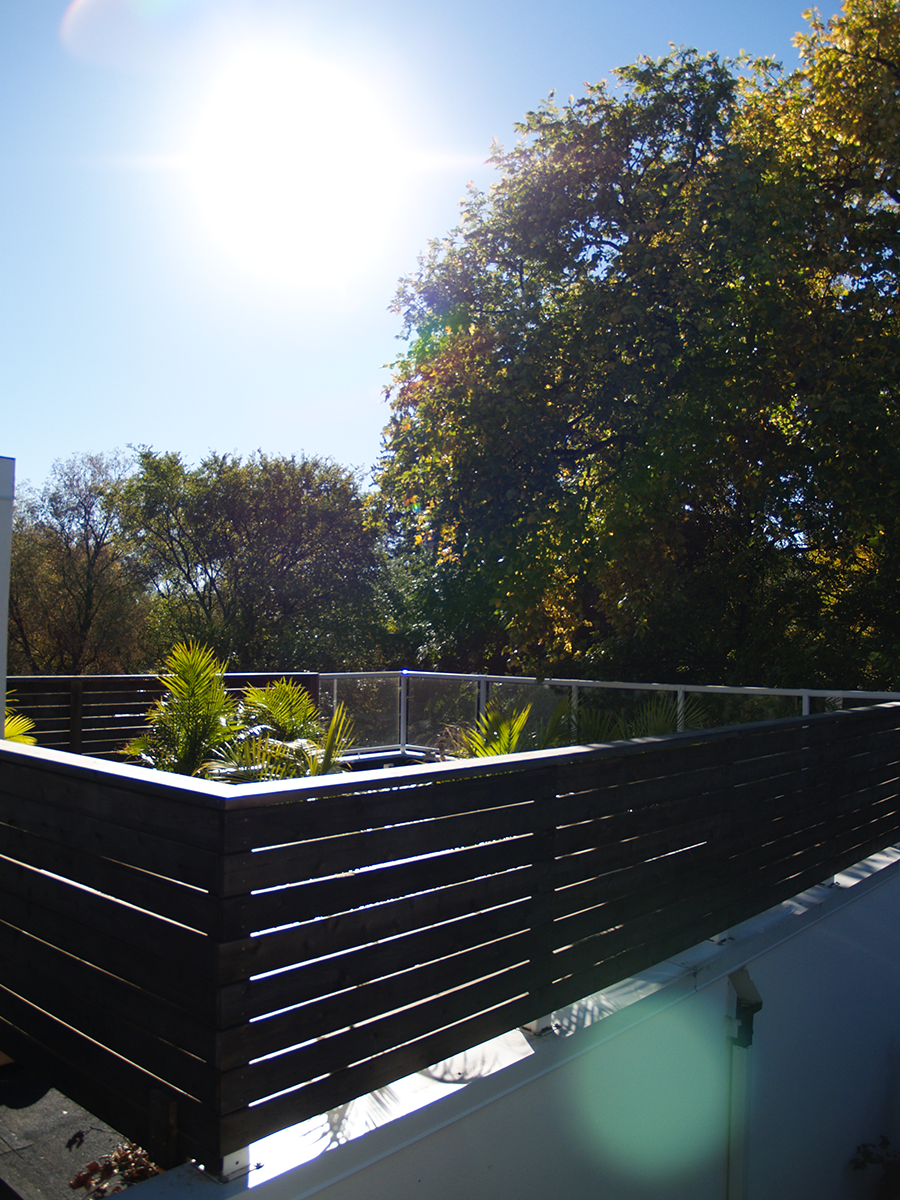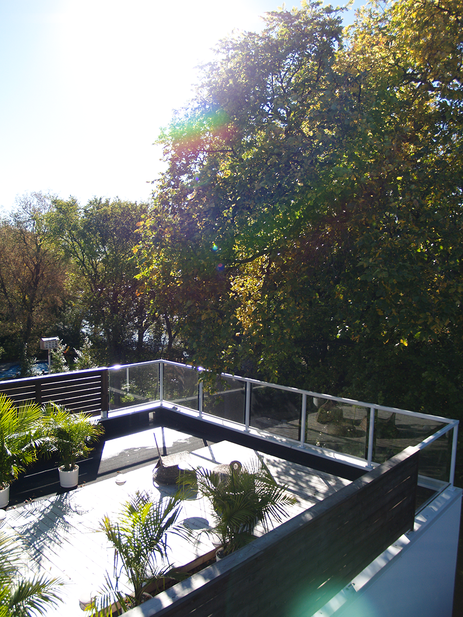 A modern addition and development of the 3rd story walkout rooftop patio. Designed to be both private and as open as possible. Gapped cedar slatting provides privacy while still allowing for the pleasing effect of sunlight to filter through. The glassed front allows unobstructed full views of the nearby river and of the surrounding treetop canopy. The cedar patio surface is “floating” to allow for adequate drainage and for longevity of the deck framing material. It is also designed and built in 4’ x 4’ modules to allow ease of removal for seasonal maintenance of the roof covering.