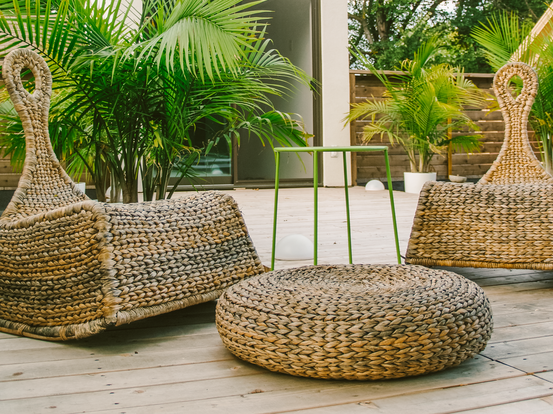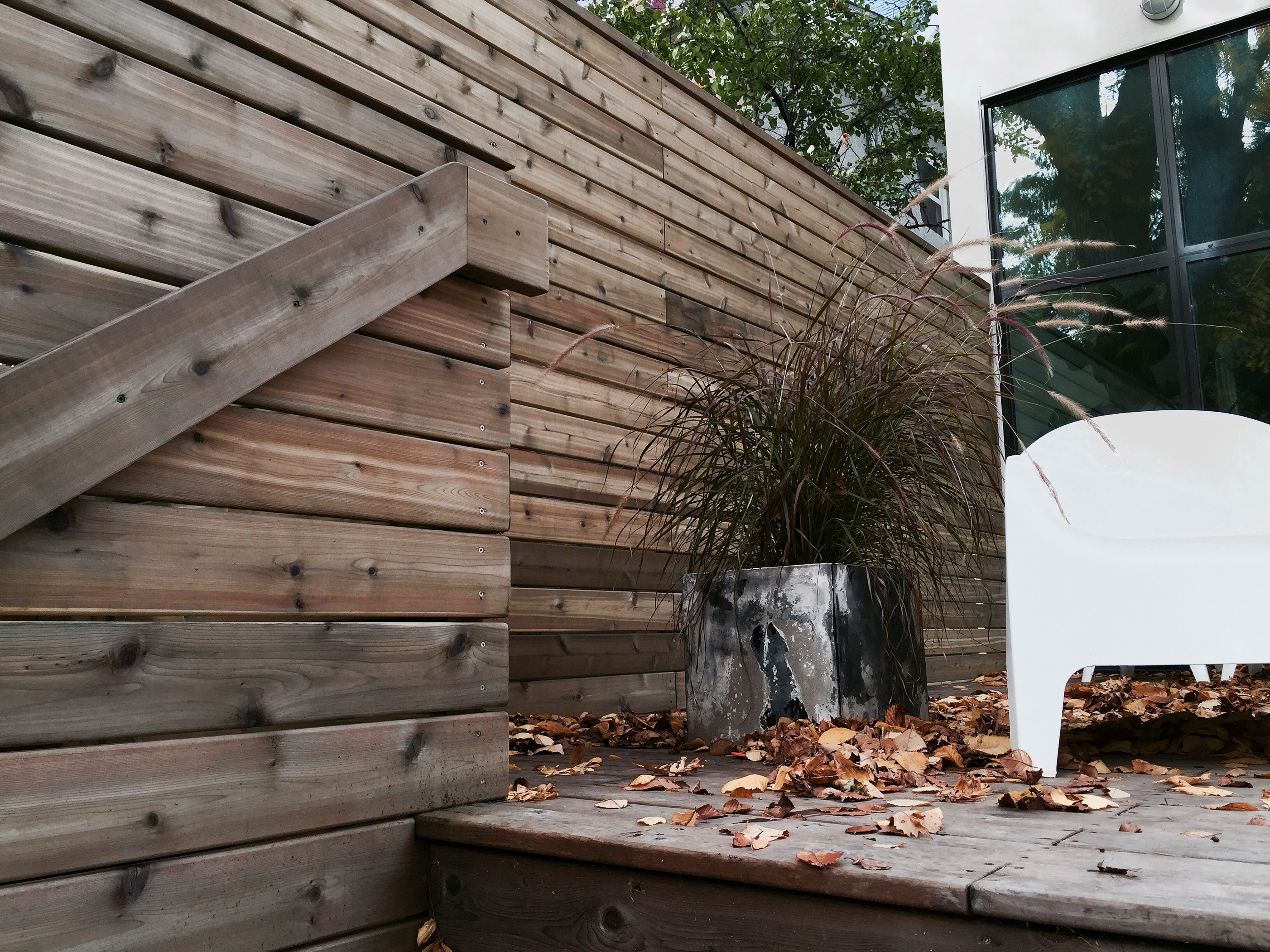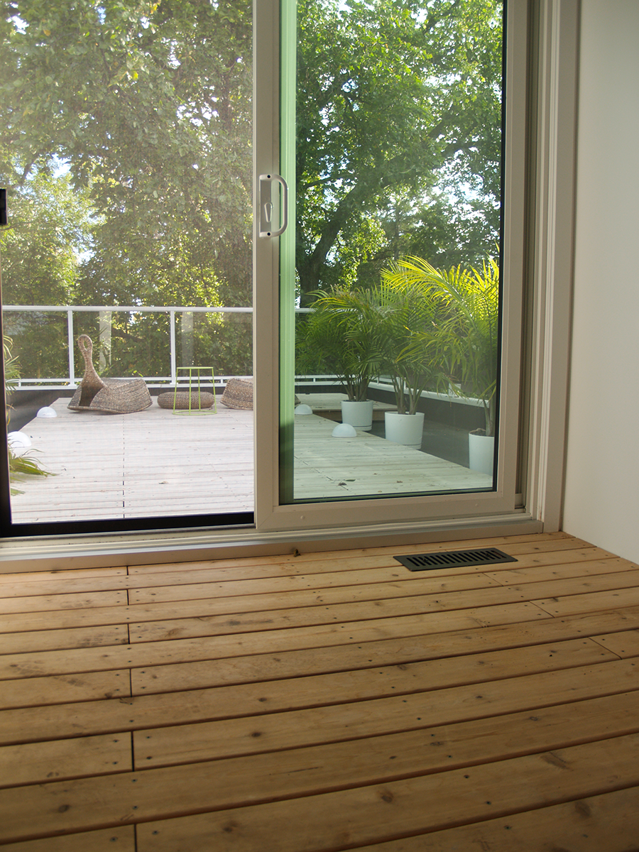 Cedar is chosen for its natural beauty and durable quality, and for continuity with the cedar patio and privacy screen below at ground level. Both material and decking pattern continues seamlessly from inside/out outside/in from the walkout interior to the patio. Design and detailing is minimal and clean lined- consistent with the modern design of the addition.